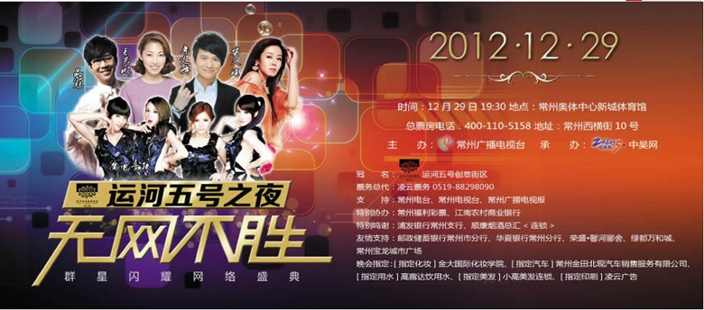 常州广播电视台主办,中吴网承办的运河五号之夜--2012无网不胜群星闪耀网络盛典,12月29日晚,常州奥体中心新城体育馆,将会给您带来一个震撼和惊叹的美丽之夜,星光灿烂名流汇聚,高露达与您同行----我们不见不散!